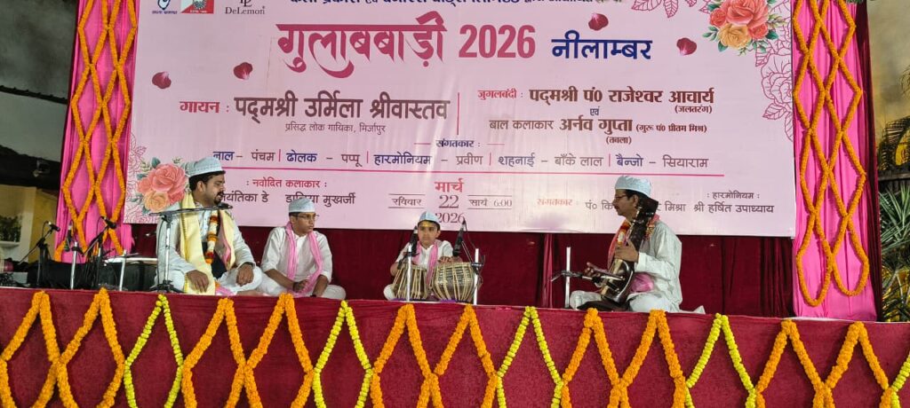 Gulabbadi 2026 Varanasi Music Event : कार्यक्रम की शुरुआत युवा कलाकारों के समूह ‘शिल्पायन’ की डालिया मुखर्जी और जयन्तिका डे ने की। उन्होंने ‘सारि सारि रतिया जगावे हो रामा…’ की मधुर प्रस्तुति से श्रोताओं का मन मोह लिया। इसके बाद प्रस्तुत की गई चैती ‘बिन पिया निंदिया न आवे हो रामा…’ ने माहौल को और अधिक भावपूर्ण बना दिया।