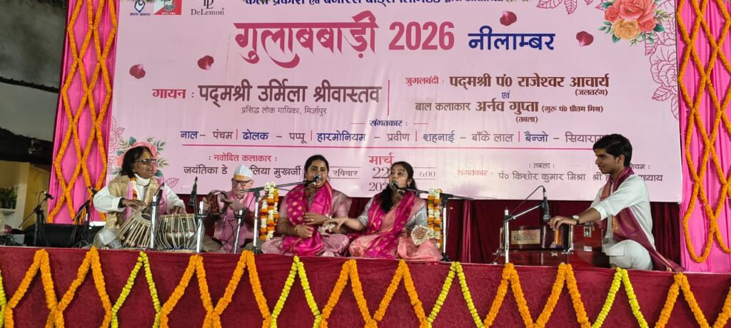 Gulabbadi 2026 Varanasi Music Event : इसके बाद पद्मश्री उर्मिला श्रीवास्तव ने मंच संभालते हुए होरी और चैती की प्रस्तुतियों से श्रोताओं को भावविभोर कर दिया। उनकी गायकी ने पूरे वातावरण को संगीत रस से सराबोर कर दिया।