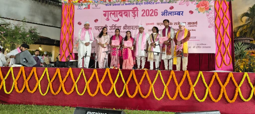 Gulabbadi 2026 Varanasi Music Event : वाराणसी। सांस्कृतिक नगरी वाराणसी में रविवार की शाम संगीत और सुरों से सजी एक यादगार महफिल का आयोजन हुआ। कला प्रकाश और बनारस बीड्स लिमिटेड के संयुक्त तत्वावधान में नीलाम्बर के आंगन में आयोजित ‘गुलाबबाड़ी 2026’ कार्यक्रम ने श्रोताओं को संगीत के रस में पूरी तरह डुबो दिया।