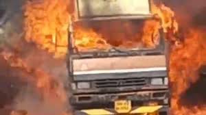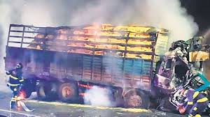 टक्कर के बाद ट्रक और कार में लगी आग, कार पूरी तरह जलकर खाक।